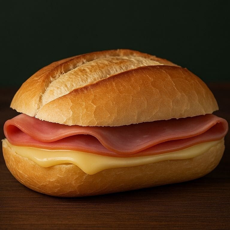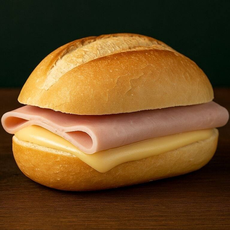 Delicioso lanche com manteiga, pão francês, 1 fatia de presunto e 1 de queijo prato