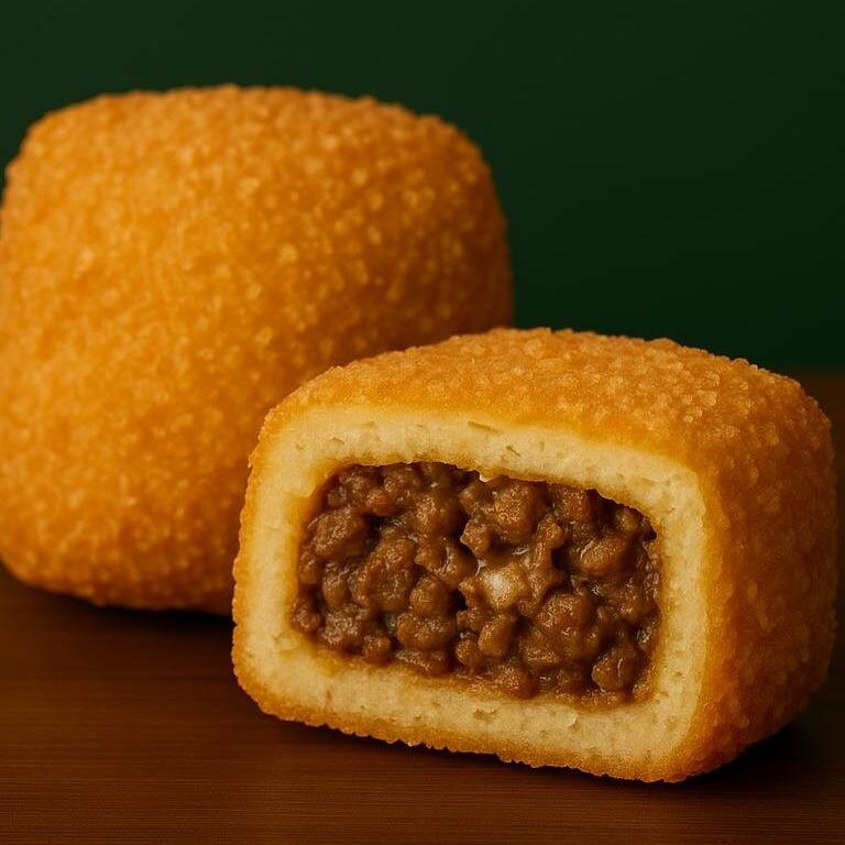 Recheio de carne moída bem temperada com massa empanada e frita. Crocante por fora, saboroso por dentro.