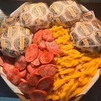 3 x-Saladas Diferenciados (pão gergelim, maionese caseira, hambúrguer Artesanal de Costela 70gr, cheddar fatiado, cheddar cremoso, picles, tomate, alface americana e molho especial tipo "mequi" ) + porções de batata com cheddar(aprox. 4500g) e Calabresa(aprox 225g).