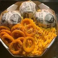 3 x-Saladas Diferenciados (pão gergelim, maionese caseira, hambúrguer Artesanal de Costela 70gr, cheddar fatiado, cheddar cremoso, picles, tomate, alface americana e molho especial tipo "mequi" ) + porções de batata com cheddar(aprox. 500g) e Onion Rings.