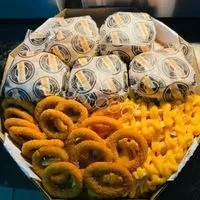5 x-Saladas Diferenciados (pão gergelim, maionese caseira, hambúrguer Artesanal de Costela 70gr, cheddar fatiado, cheddar cremoso, picles, tomate, alface americana e molho especial tipo "mequi" ) + porções de batata com cheddar(aprox. 800g) e Onion Rings.