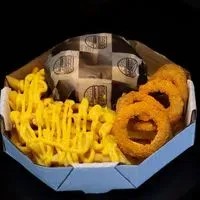 1 x-Salada Diferenciado (pão gergelim, maionese caseira, hambúrguer Artesanal de Costela 70gr, cheddar fatiado, cheddar cremoso, picles, tomate, alface americana e molho especial tipo "mequi" ) + porções de batata com cheddar(aprox. 250g) e Onion Rings.