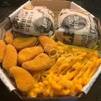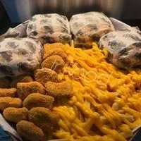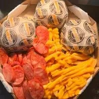 5 x-Saladas Diferenciados (pão gergelim, maionese caseira, hambúrguer Artesanal de Costela 70gr, cheddar fatiado, cheddar cremoso, picles, tomate, alface americana e molho especial tipo "mequi" ) + porções de batata com cheddar(aprox. 800g), Calabresa(aprox 350g) e Nuggets(aprox. 16 Un.)