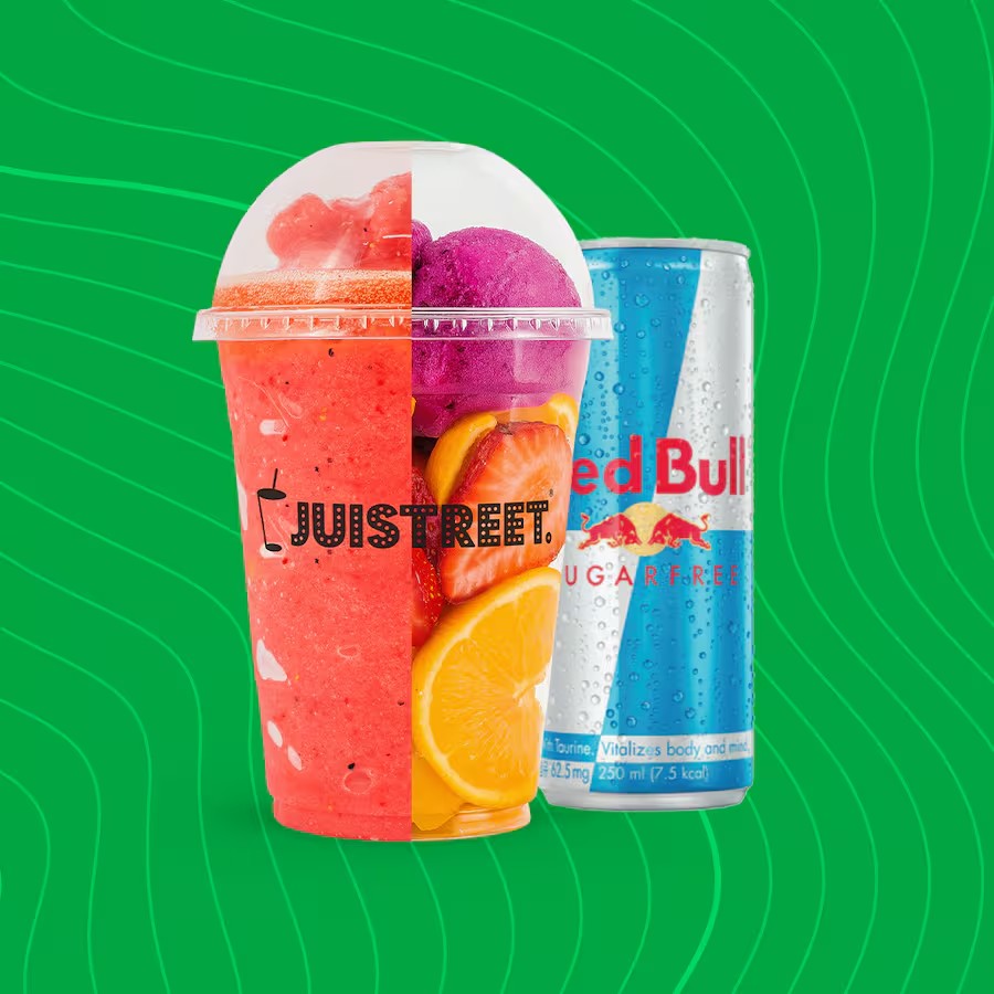 Vibrante, funcional e cheio de antioxidantes, com um boost de energia para colorir seu Dia. (Ingredientes: Redbull Sugarfree, pitaya, manga, morango e laranja).