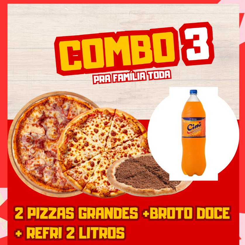 2 Pizzas Grande 8 Fatias cada + Pizza Broto Doce 4 Fatias BRINDE + Refrigerante 2 Litros