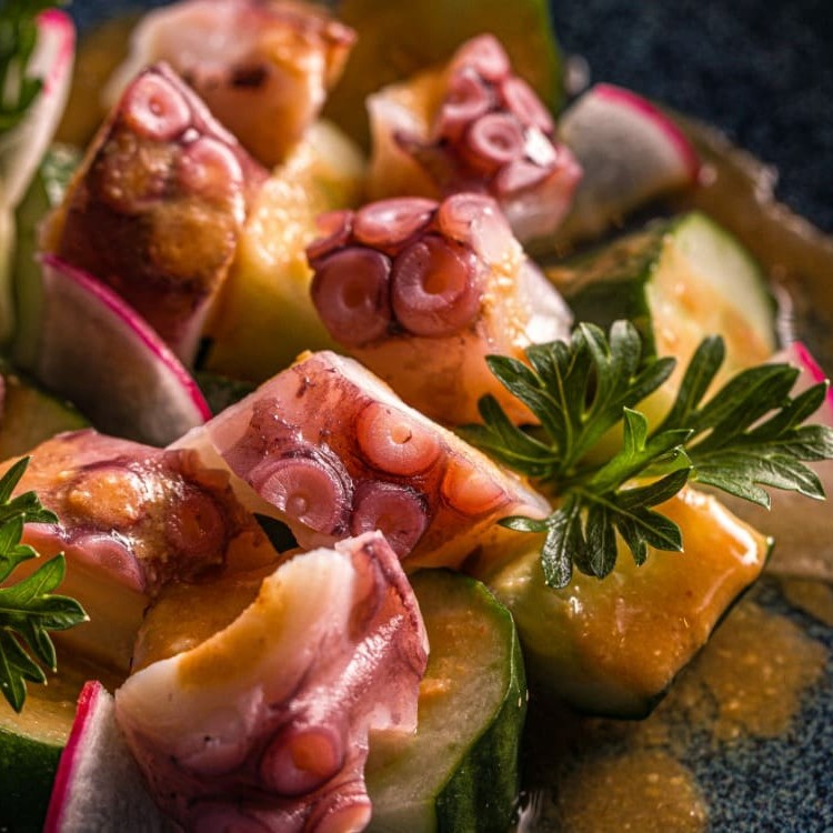Fatias macias de polvo cozido no sous vide, acompanhadas de pepino ao estilo tsukemono e molho à base de missô. Frescor, textura e umami em perfeita harmonia.