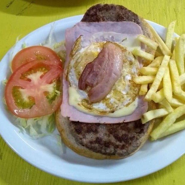 Pão, 2 hambúrgueres artesanais,(100g cada), bacom, alface americana, tomate, fritas, ovo, maionese, queijo e presunto