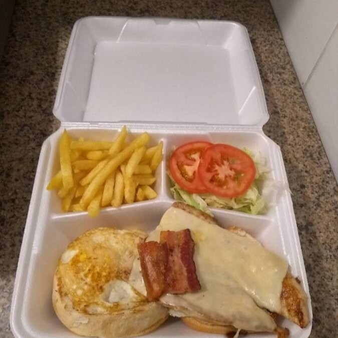 Pão, filé de frango,(180g), bacon, alface americana, tomate, fritas, maionese, ovo e queijo