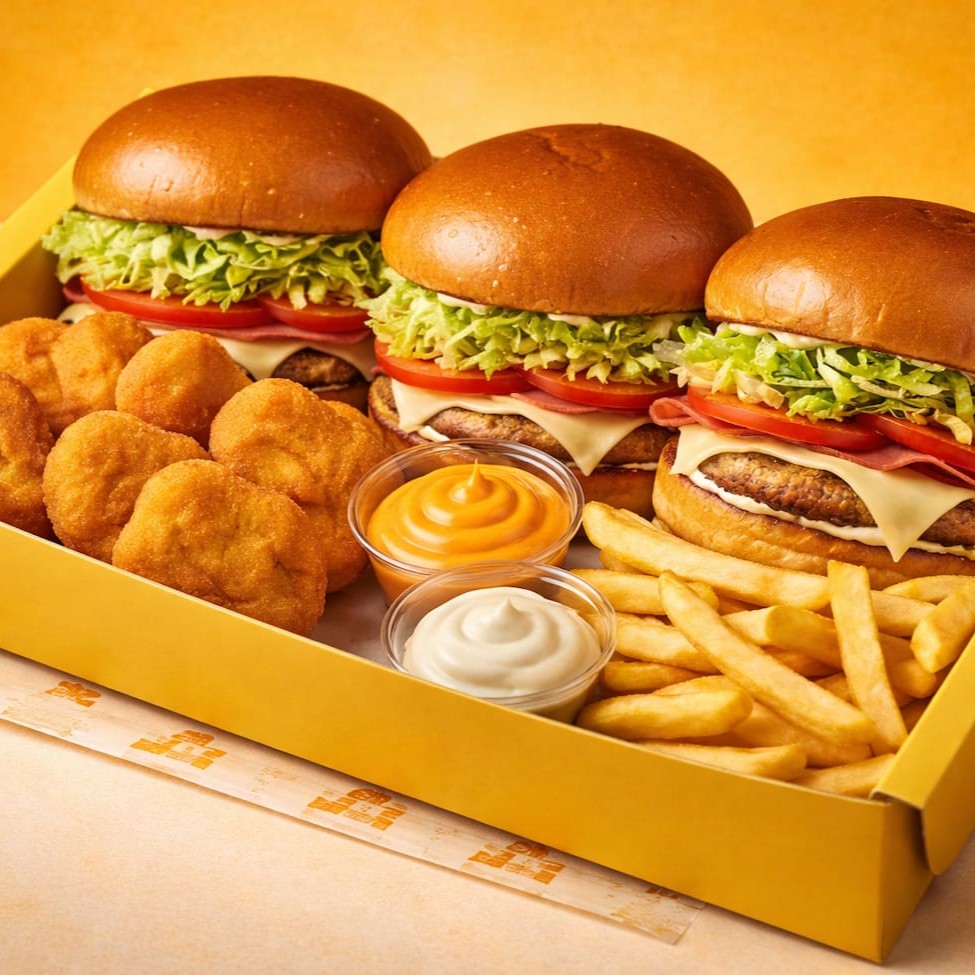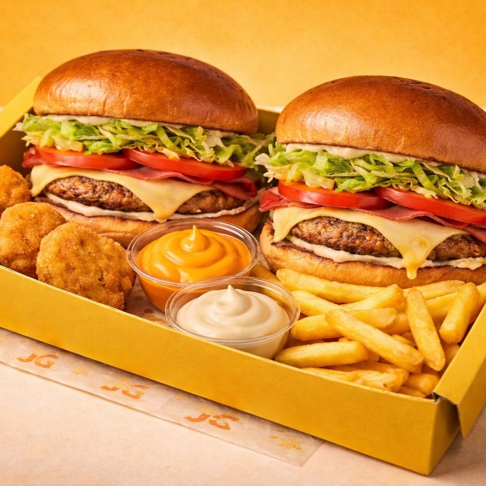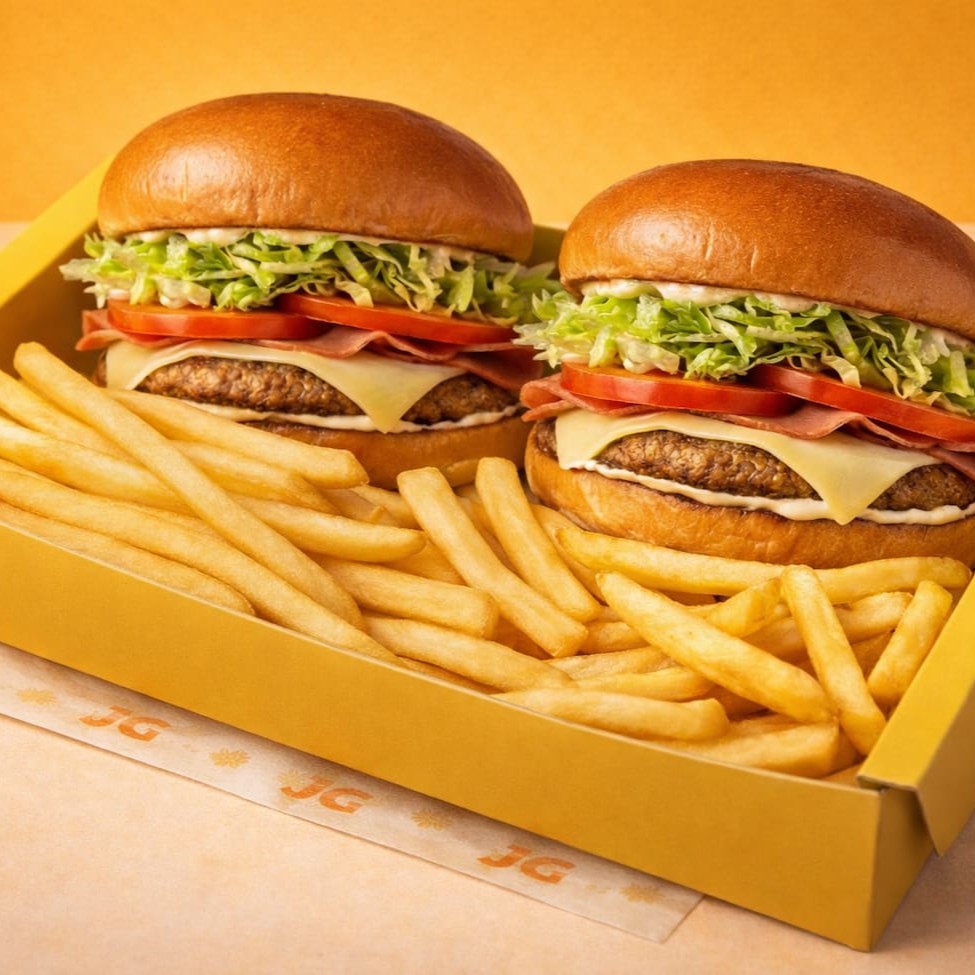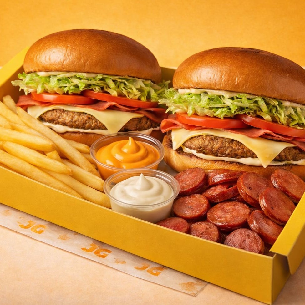 2 deliciosos hambúrgueres tradicionais com pão macio e dourado, hambúrguer suculento na chapa, maionese cremosa, presunto selecionado e queijo derretido no ponto perfeito.