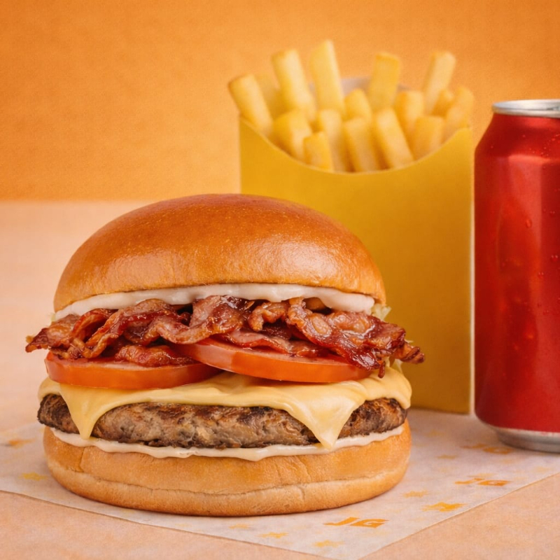 O clássico que nunca falha! Pão selado na chapa com hambúrguer suculento de 56g, presunto selecionado, queijo derretido, bacon crocante, alface fresquinha, tomate e a maionese especial da casa que dá o toque final. Acompanha batata frita dourada e crocante + Coca-Cola gelada para completar o combo perfeito. 🔥 Sabor de verdade, estilo raiz e preço que cabe no bolso.
