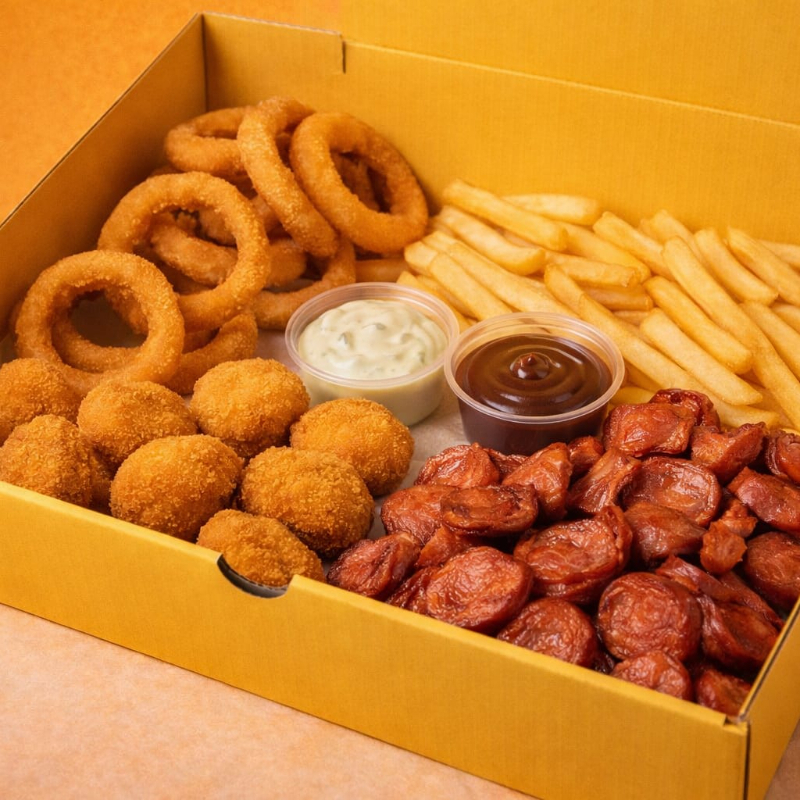Uma porção gigante com 1,2kg antes do preparo, recheada de sabor: 🍗 15 unidades de frango empanado super crocante 🧅 12 onion rings douradas e crocantes 🍟 batata frita sequinha e irresistível 🌭 calabresa frita bem suculenta Tudo acompanhado de cheddar cremoso e o molho especial da casa, que deixa cada mordida ainda mais viciante. 🔥 Fartura de verdade, feita no capricho! Perfeita para dividir, petiscar e aproveitar com a galera. Serve até 3 pessoas (aprox. 1,2kg).