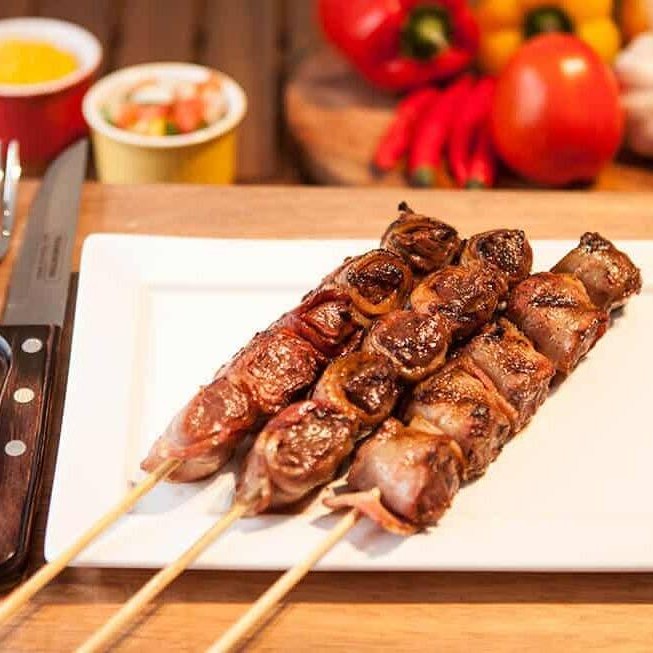 O lendário Alcatra & Bacon é um mito pelo seu sabor inigualável! Um delicioso espeto de carne com fatias saborosas de bacon enroladas. 90g