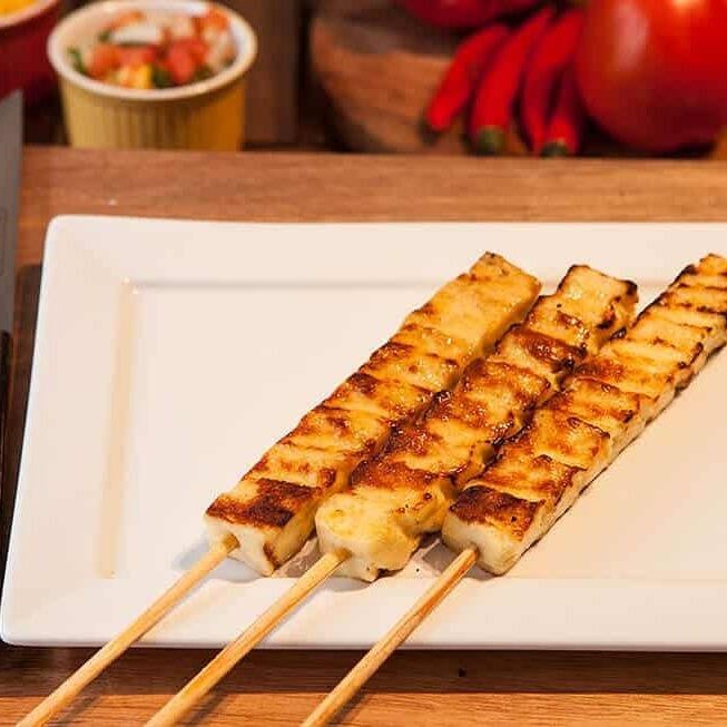 Um espeto de Queijo Coalho com uma leve camada crocante preparada na nossa churrasqueira de alta performance.