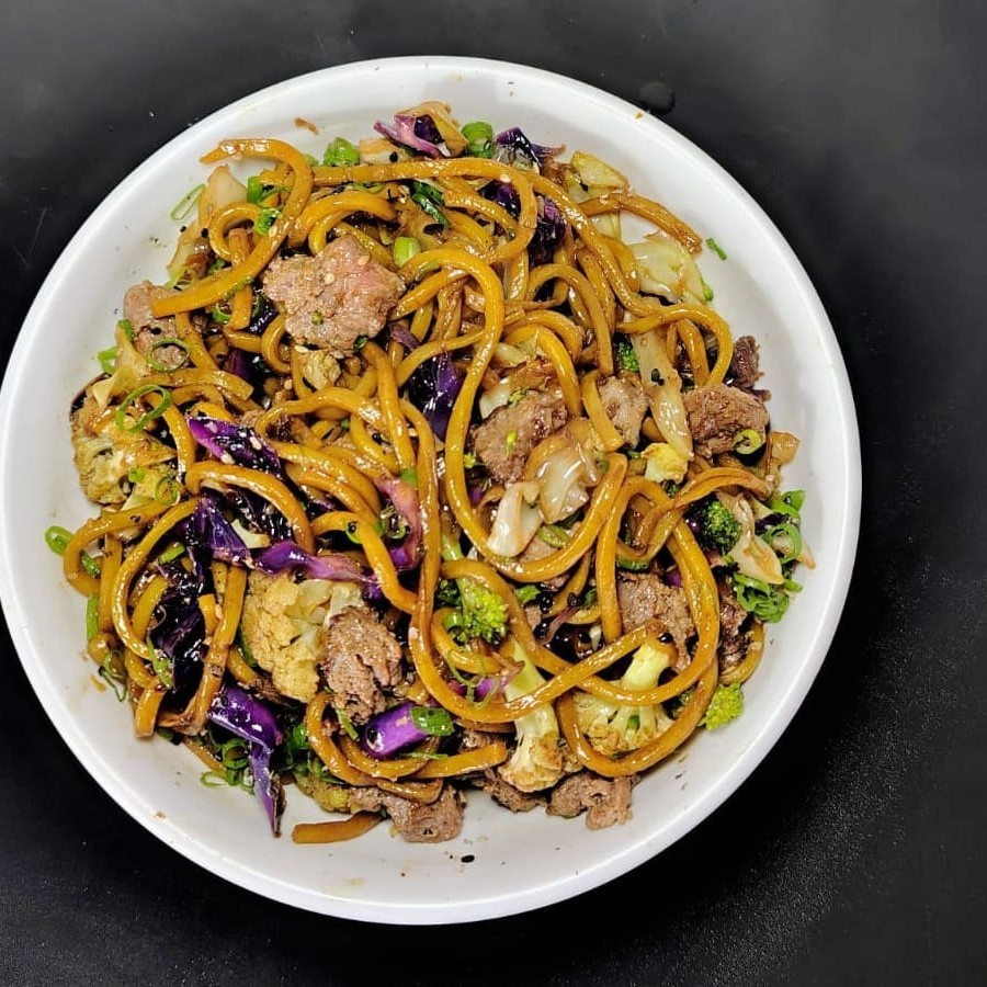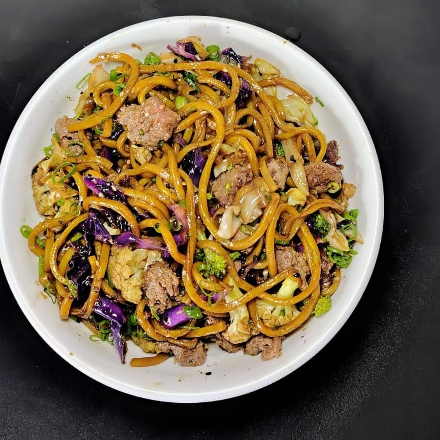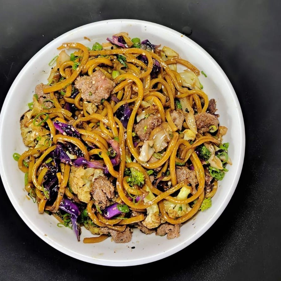 Saborosas tiras de mignon, legumes, e molho especial, com macarrão cozido. Serve aprox. 500 gm #japones #sushi #yakissoba #festival # #delivery #delicioso #entregarápida
