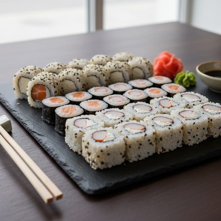 Arroz, nori, manta de salmão,kani e cream cheese