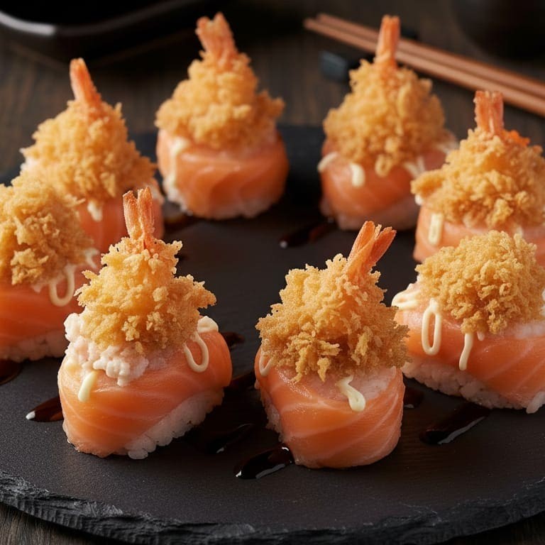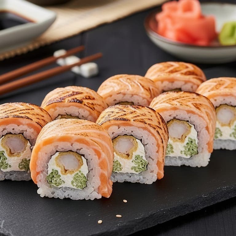 Um Uramaki Ebitem envolto em uma deliciosa manta de salmão maçaricada com gergelim