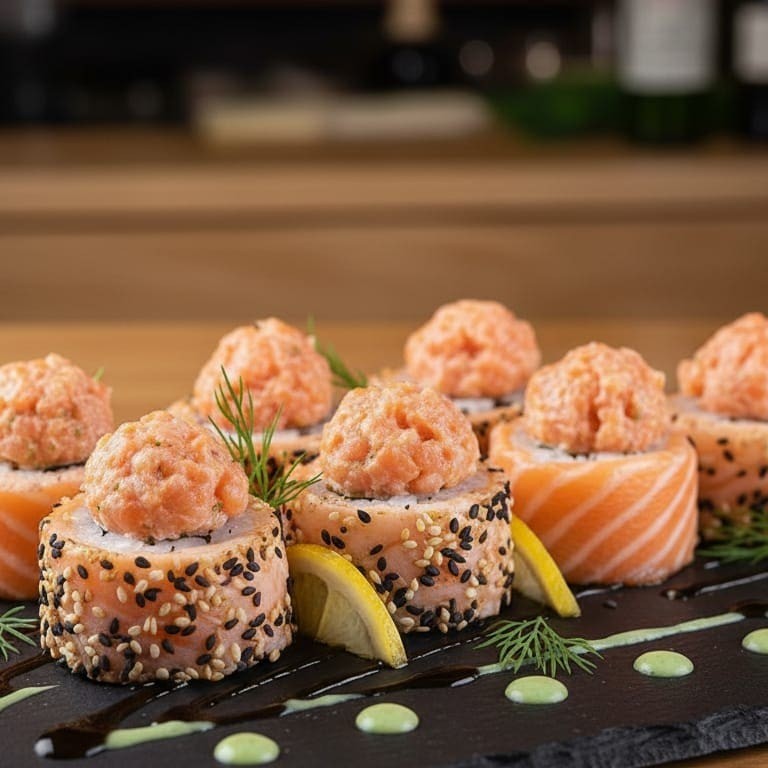 Salmão em envolto em Arroz e Patê de Salmão Batido