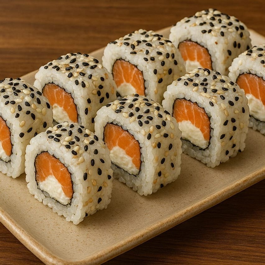 Um Uramaki Filadelfia envolto em uma deliciosa manta de salmão com gergelim