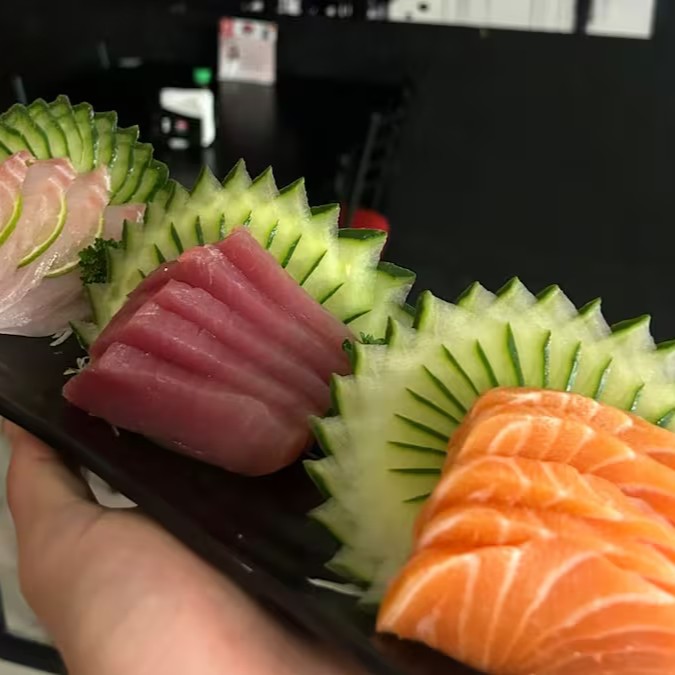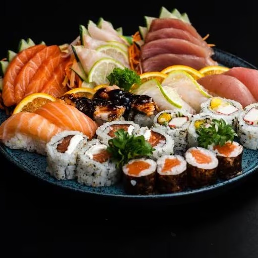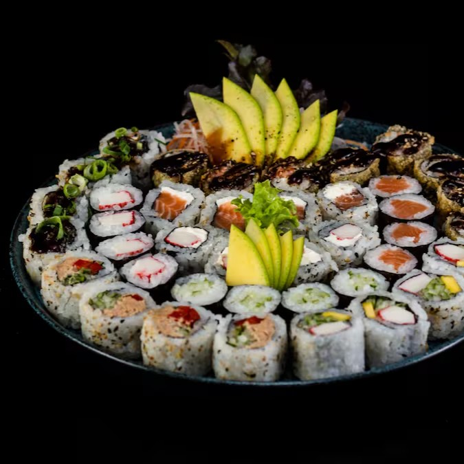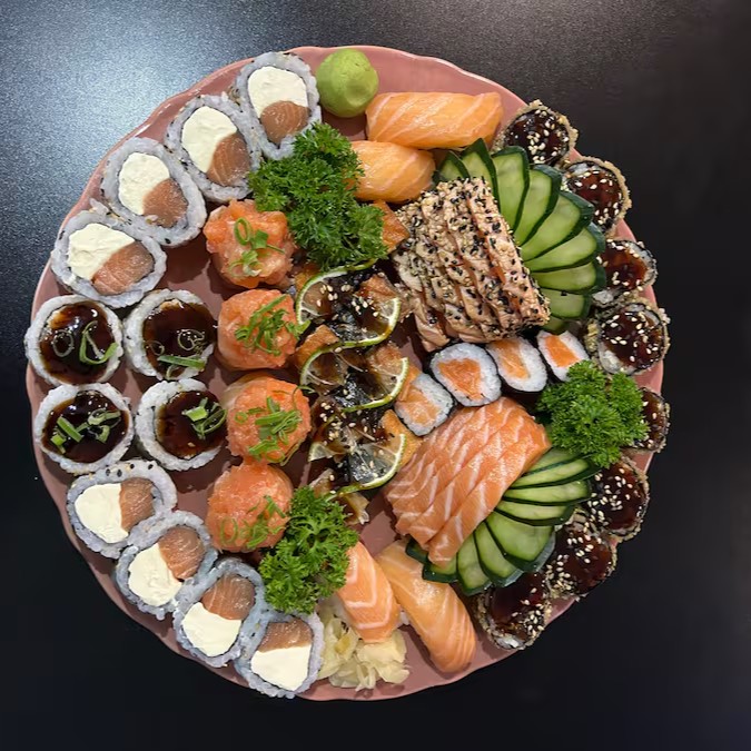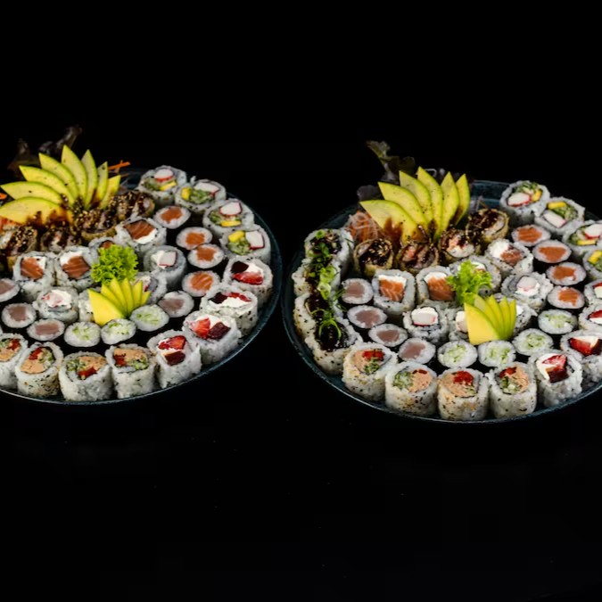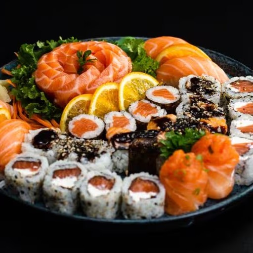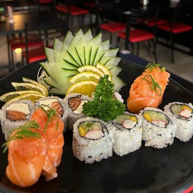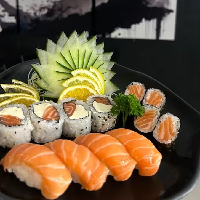 Sashimi salmão 4, P. Branco 4, atum 4, Uramaki Filadélfia 4, Califórnia 4, Nagano 4, Niguiri salmão 2, P. Branco 2, Atum 2, Skin 2.