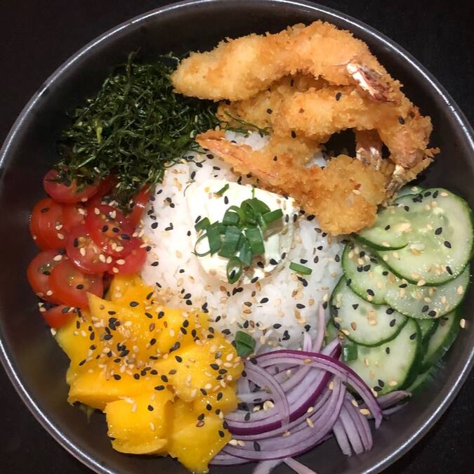 Sushi enrolado a mão com recheio de arroz e camarão empanado