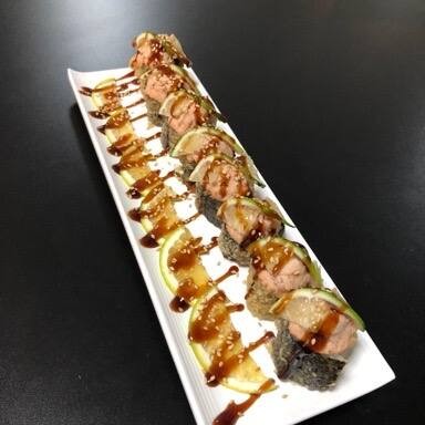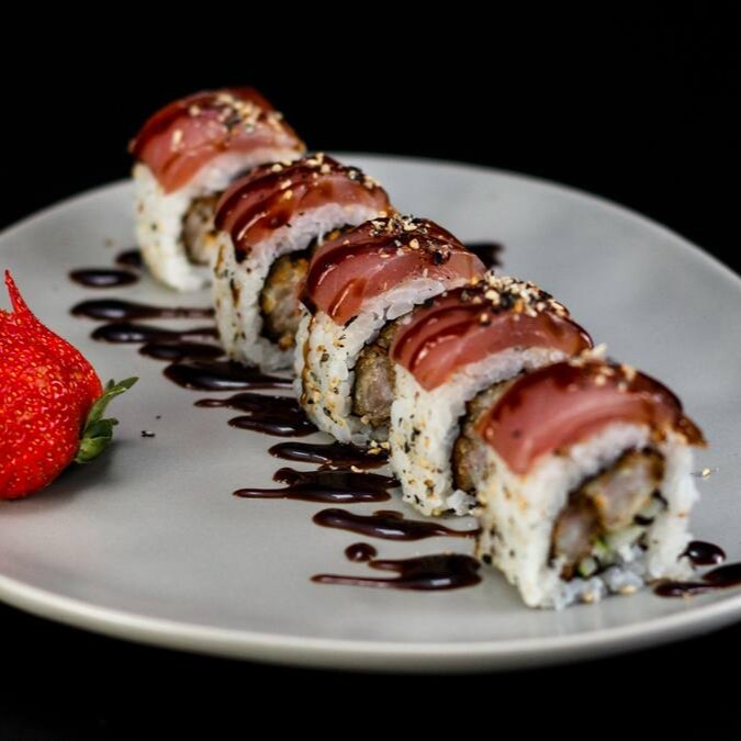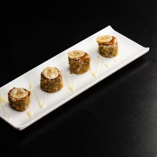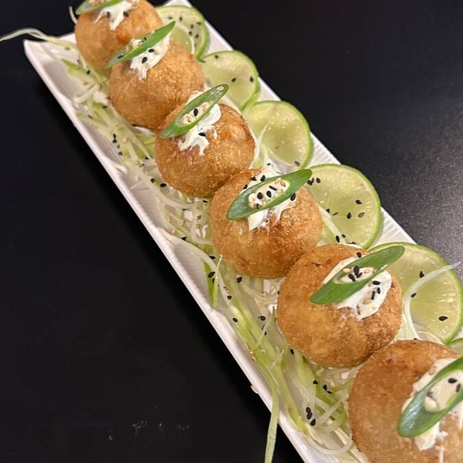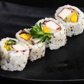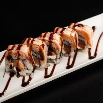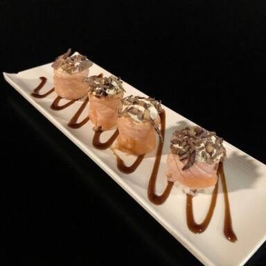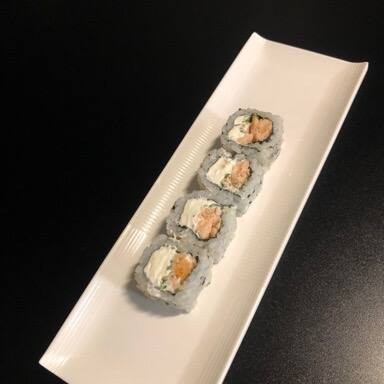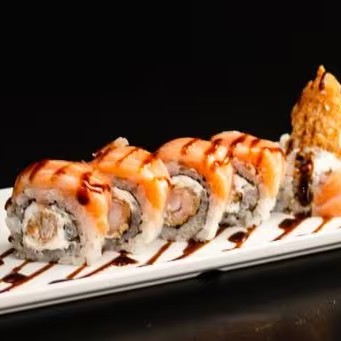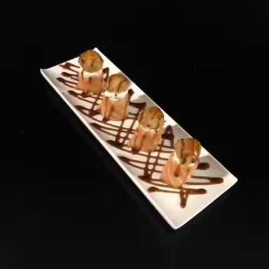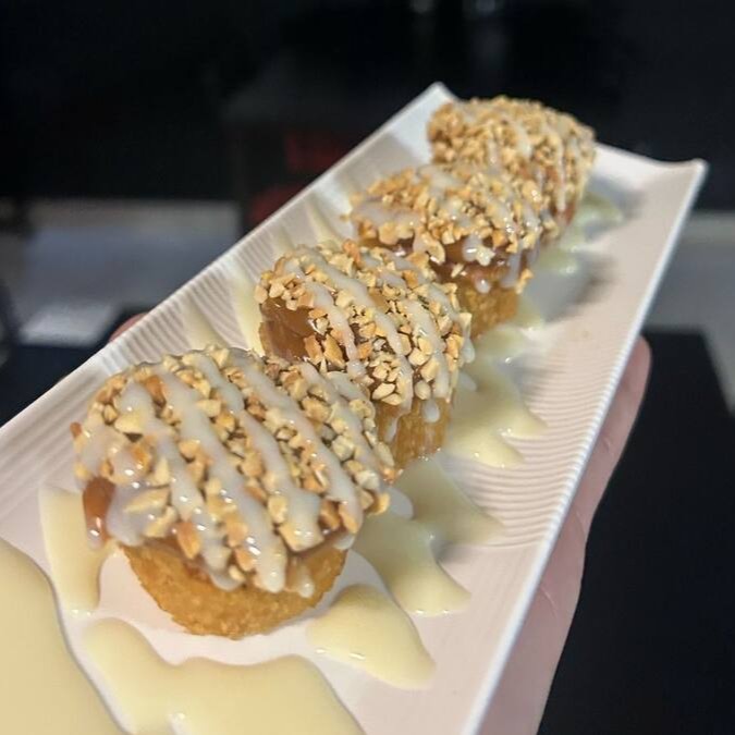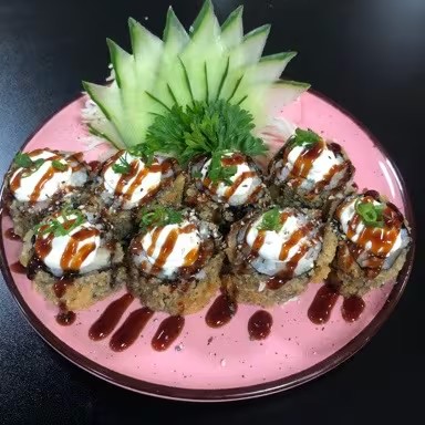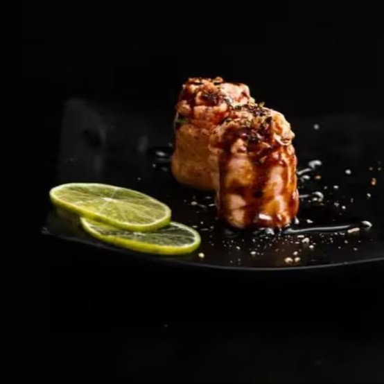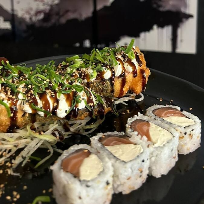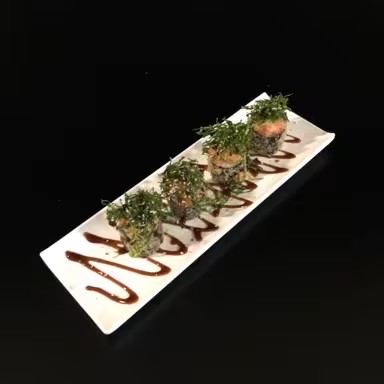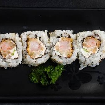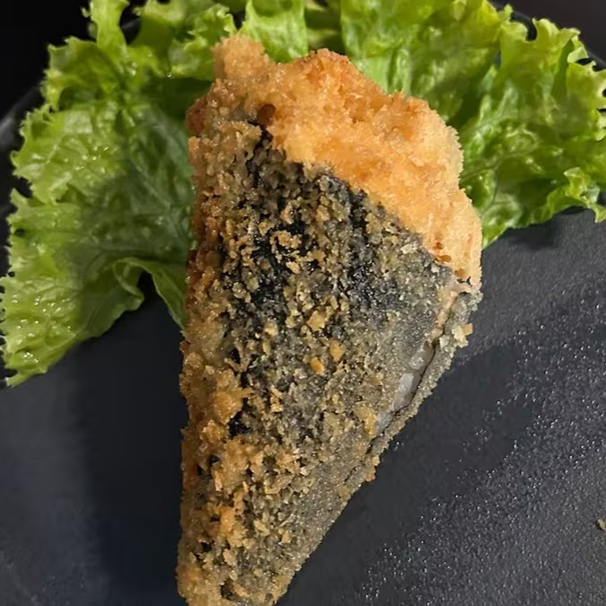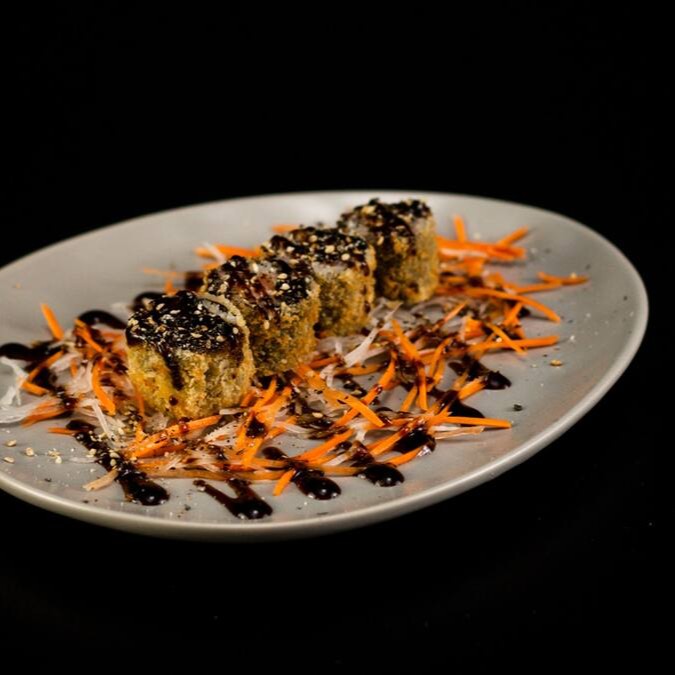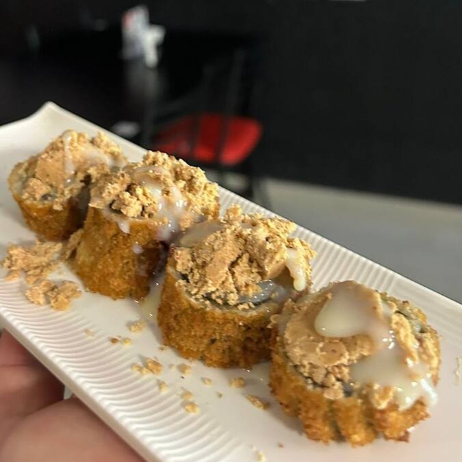 Sushi Enrolado Com Recheio de Arroz , Salmão e Cream Cheese, Empanado e Frito. (Fechado)