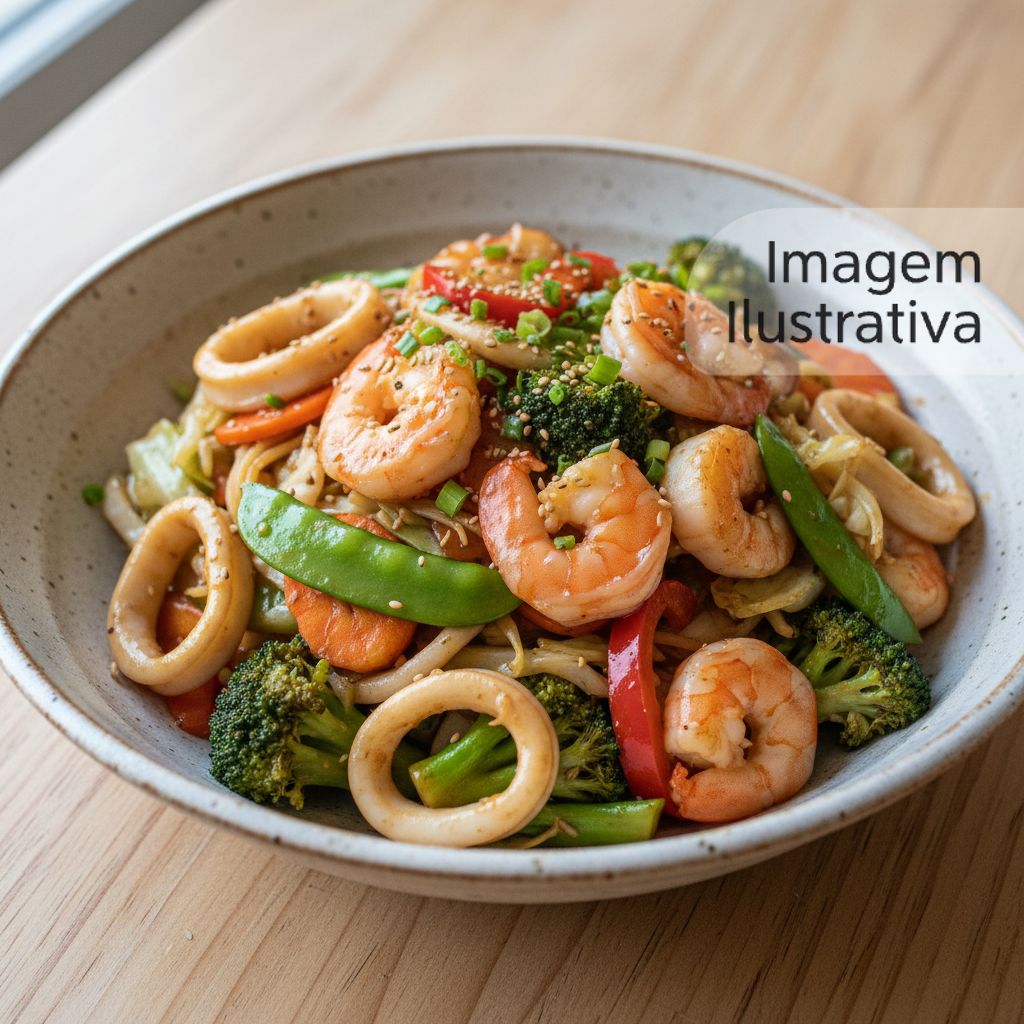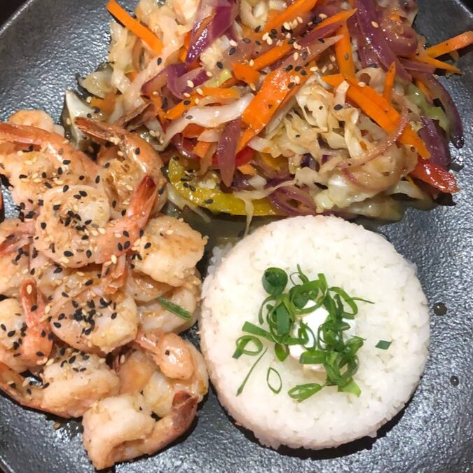 Camarão saltiado , acompanha legumes e Gohan.