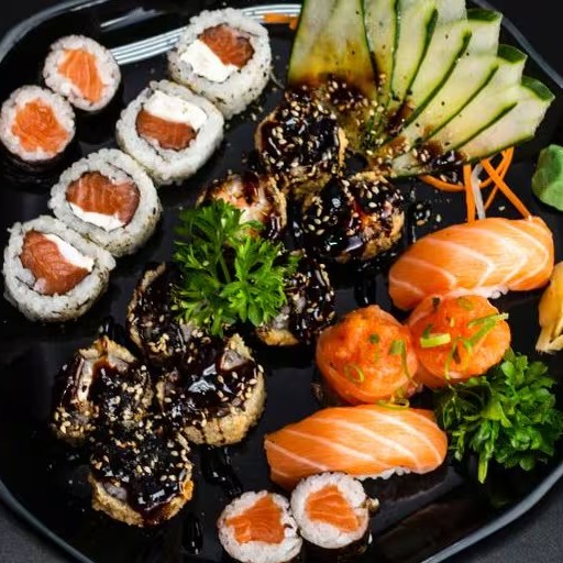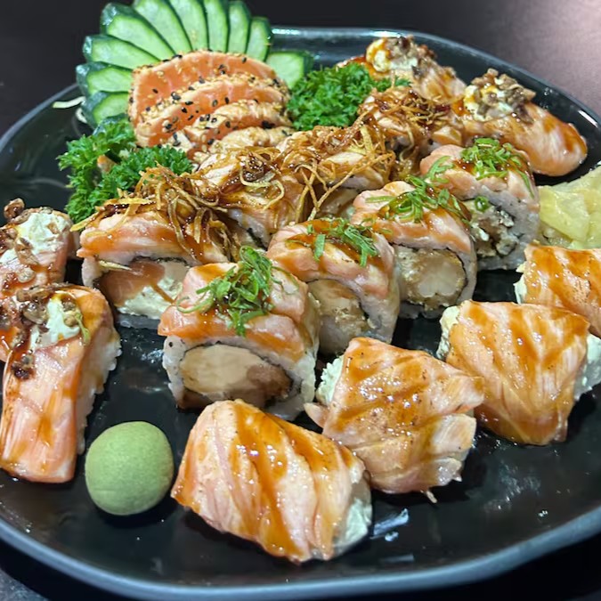 Sashimi Salmao 6 , Sashimi Salmao Selado 6 , Uramaki filadelfia 10 , Hot filadelfia 8 , Joe 4 , Niguiri Salmao 4 , Niguiri Skin 4 , Shake Maki 4 , Uramaki Skin 4.
