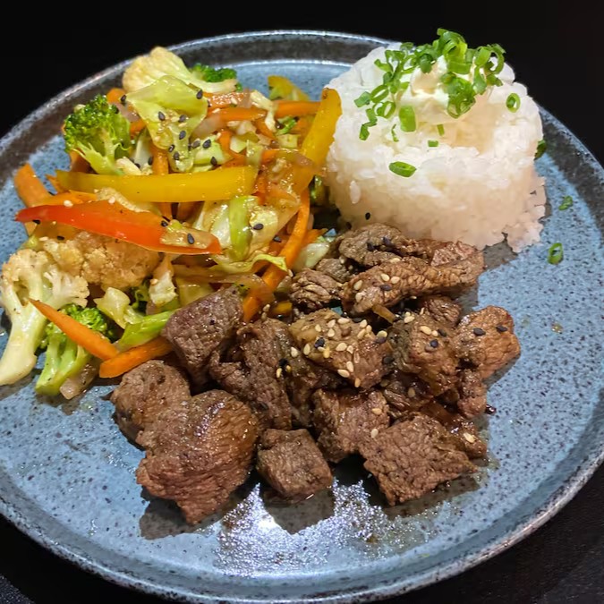 Carne grelhada , acompanha legumes e Gohan.
