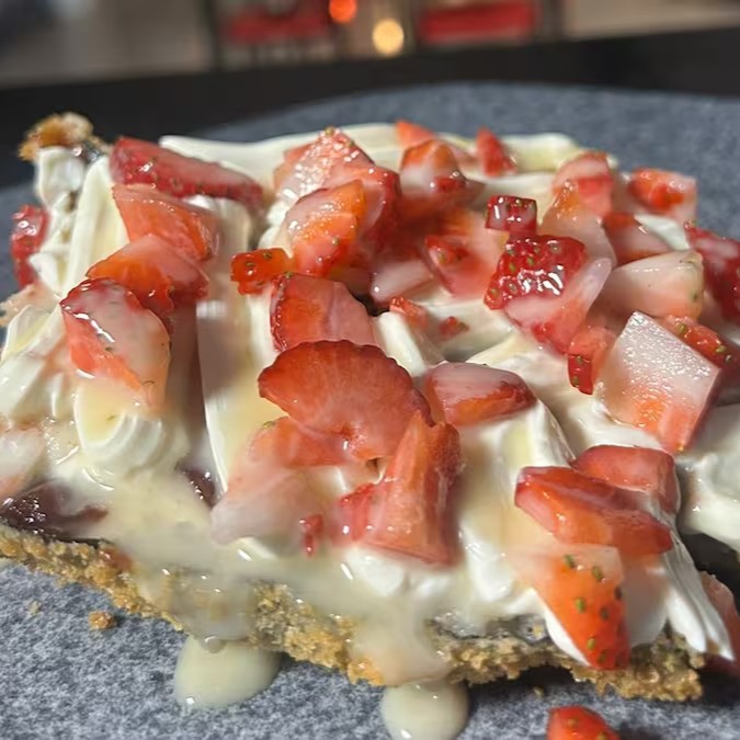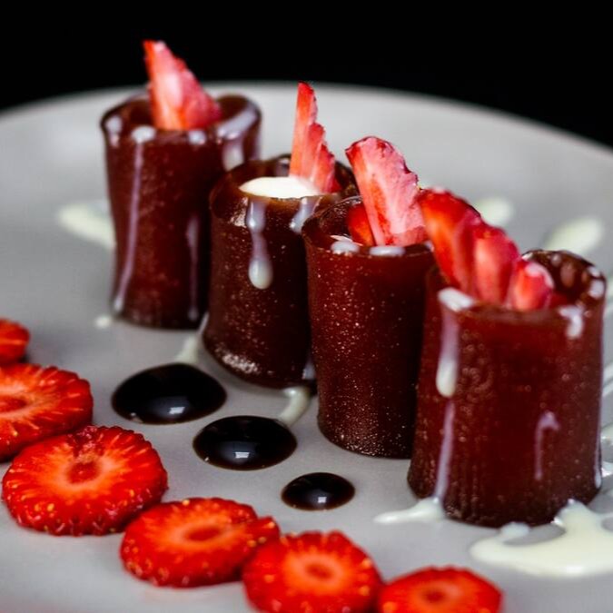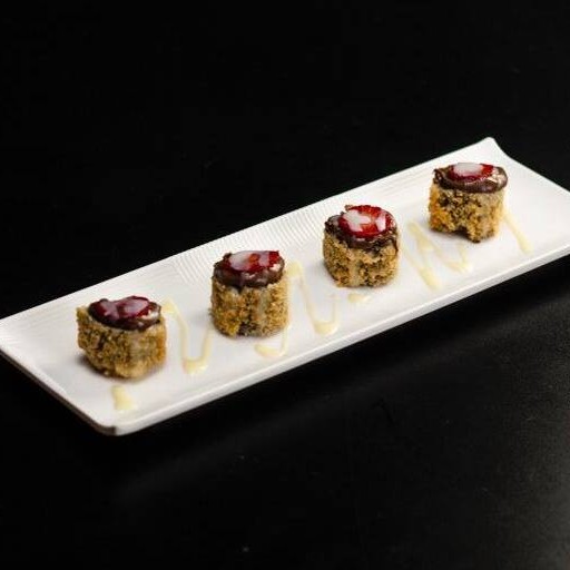 Temaki feito com arroz japones, goiabada e morango. Finalizado com Cream cheese e leite condensado.