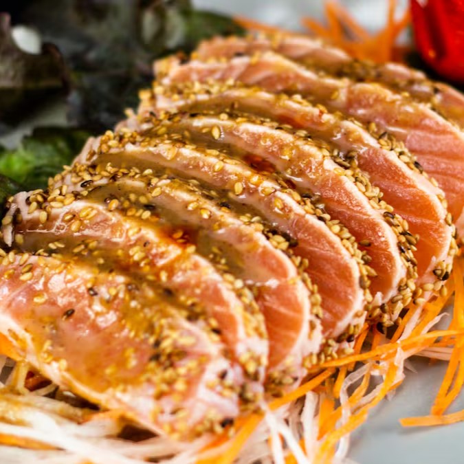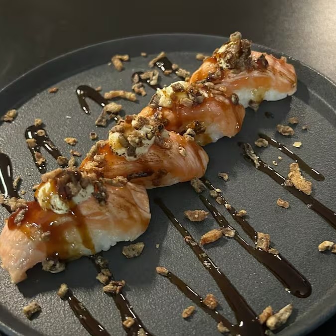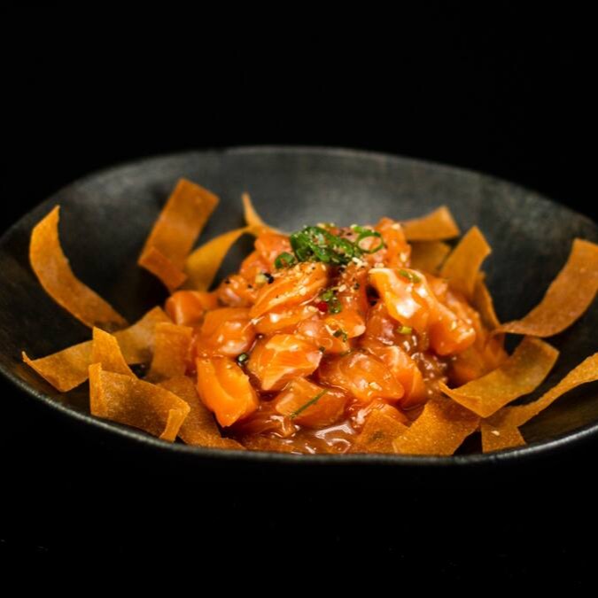 Salmão selado + cream Chesse finalizado com cebola crispin e molho tare .