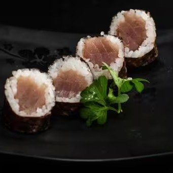 Sushi enrolado a mão com recheio de arroz, atum e cebolinha.