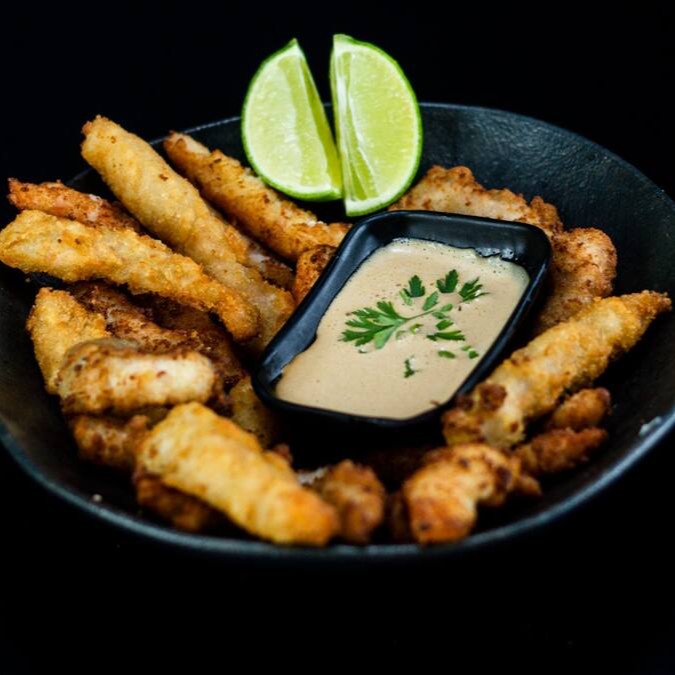 Bolinhos de Salmão empanados farinha panko e fritos .