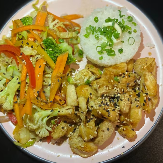 Frango grelhado , acompanha legumes e Gohan.