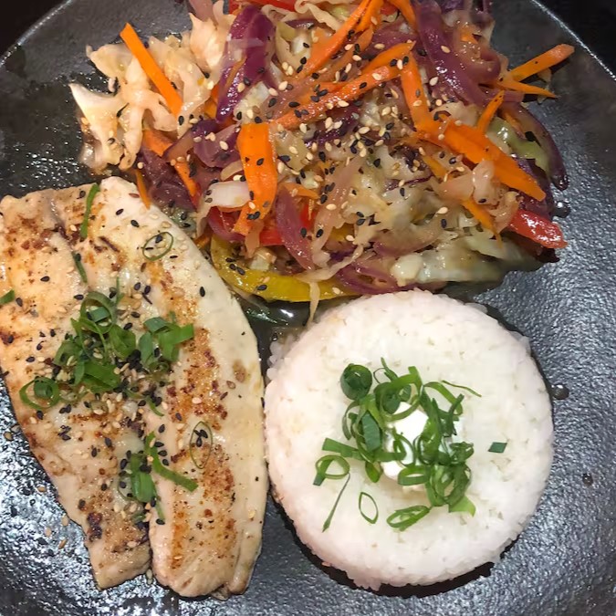 Tilapia grelhada, acompanha legumes e Gohan.
