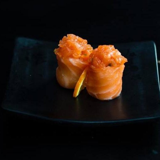 Sushi enrolado a mão com recheio de arroz e salmão batido.