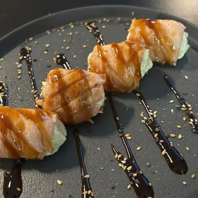 Salmão recheado com cream cheese , finalizado com molho tare.