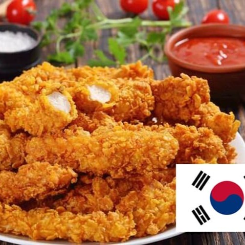 "Tiras De Filé De Peito Empanado Com Molho Picante A primeira parada é na culinária coreana! Quem conhece sabe como o coreano adora uma refeição ""quente"". 6 Deliciosas tiras de filé de peito sassami, sendo cuidadosamente empanados e fritos com temperos especiais e embebidos em molho agridoce picante."
