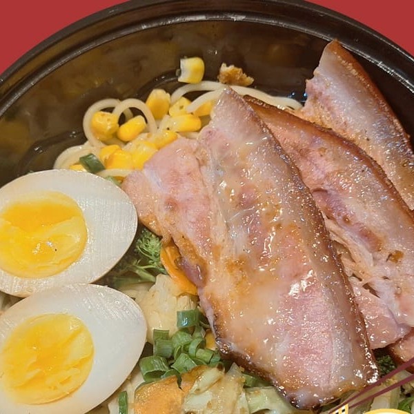 Misso lamen bacon vai ovo com gema cremosa, legumes refogados e 3 fatias de bacon de copa lombo. O caldo vai em uma embalagem separada para conservar a qualidade dos ingredientes, principalmente a massa do lamen. (imagem ilustrativa) Nosso misso lamen é preparado com o caldo de galinha de produção própria que leva mais de 6 horas para ficar pronto. Também na pasta de misso são acrescentados mais 10 temperos japoneses e orientais para acrescentar mais sabor ao caldo. A massa utilizada tem 30cm de comprimento seguindo a tradição dos melhores lamenyas do Japão, inclusive com farinha de trigo importada. O resultado é um lamen preparado com muito cuidado e carinho e com sabor que irá surpreender.