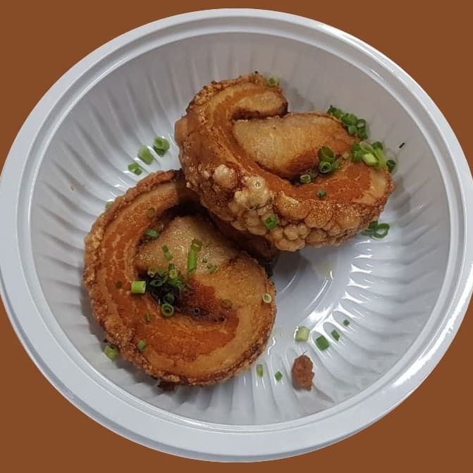A porção é feita com a panceta suina. Ela é temperada com sal, pimenta do reino e cachaça e depois enrolada em formato de rocambole. Depois é assada. Depois de assada ela é fatiada em porções e refrigerada. A finalização ocorre com a fritura da porção que dá a crocância da pururuca. Fica muito bom. Acompanha molho tonkatsu. Porção com aproximadamente 250g. Imagem ilustrativa