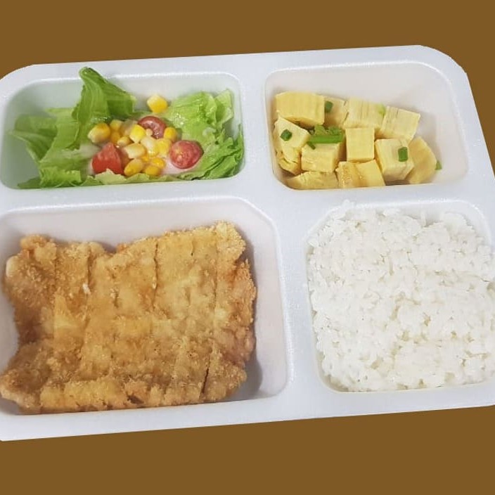 Shiro gohan (arroz japonês), misoshiro e peito de frango empanado. Acompanha salada (alface, tomate cereja com molho rose) e porção de tamagoyaki cubos com cebolinha