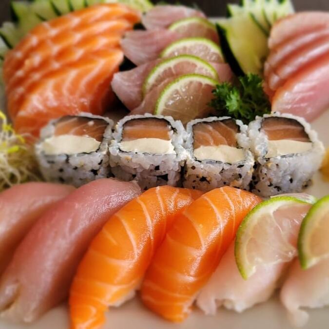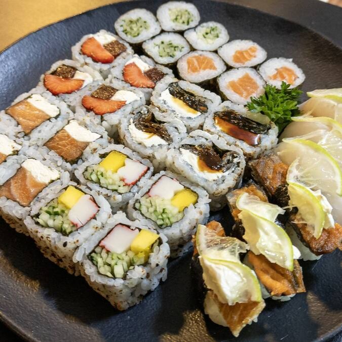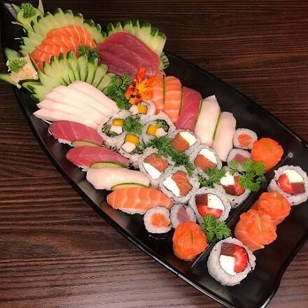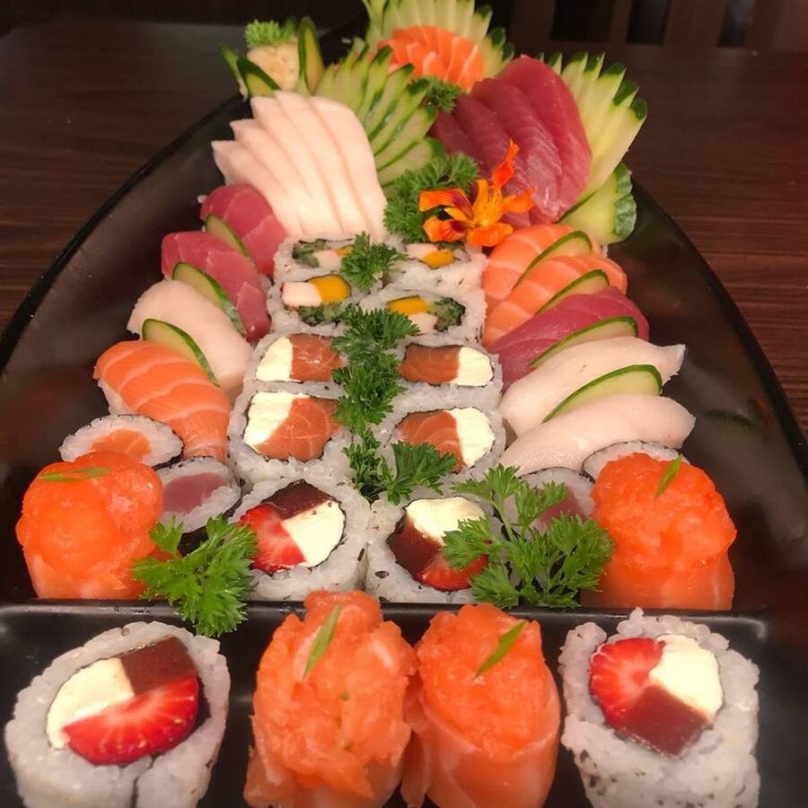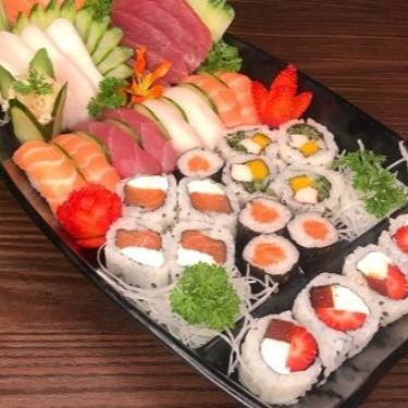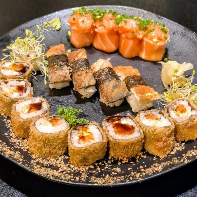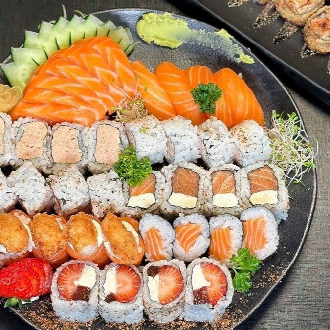 12 sashimis variados, 8 nigiris variados, 04 california, 04 filadelfia, 04 romeu e julieta, 04 shake maki