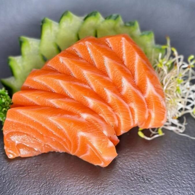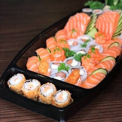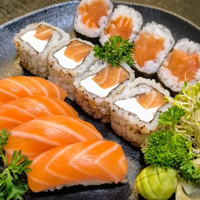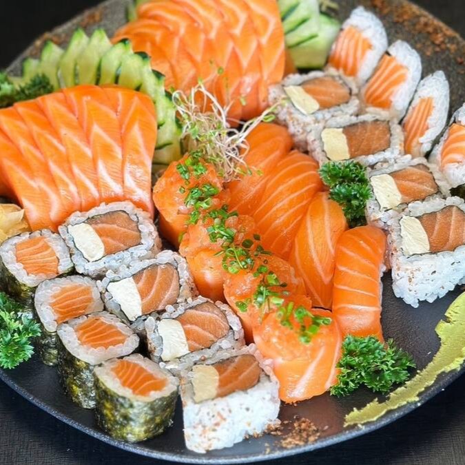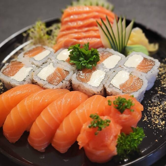 12 sashimi de salmão, 08 filadelfia, 08 shake maki, 04 niguiri de salmão, 04 joe