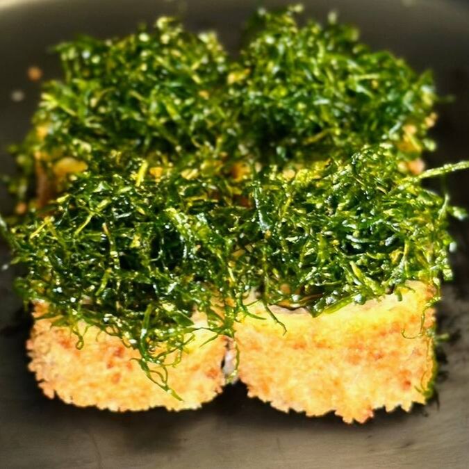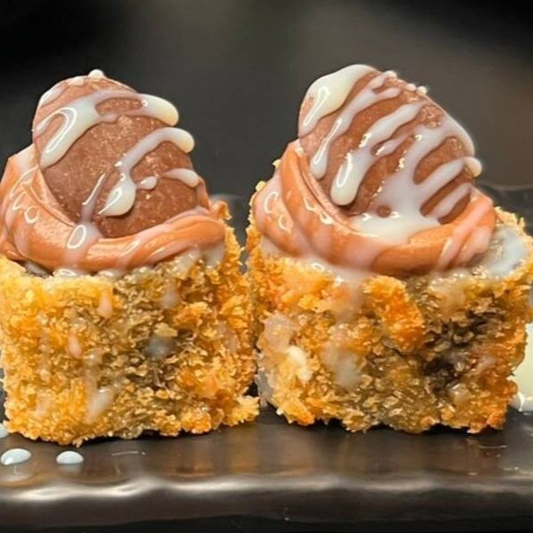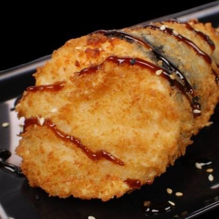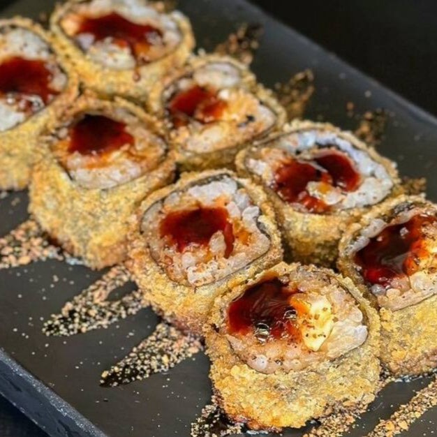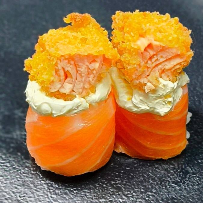Temaki empanado inteiro com salmão grelhado, cream cheese e arroz. Acompanha molho tarê