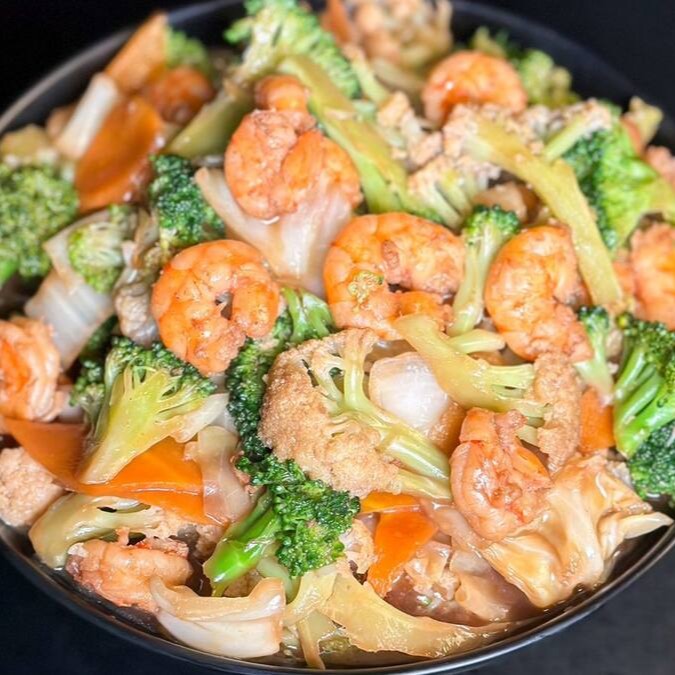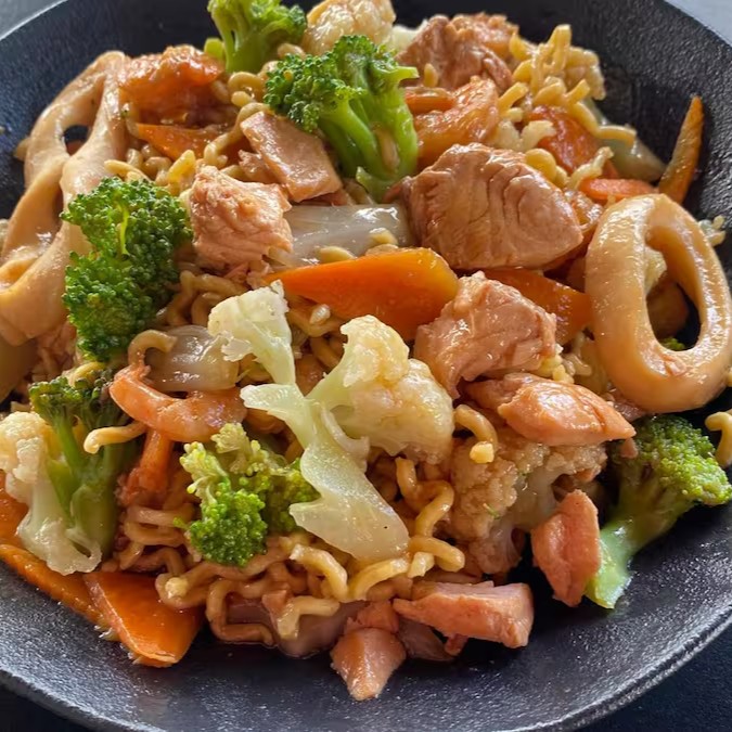 Salmão, lula, camarão, legumes e molho oriental especial. Macarrão frito ou cozido.