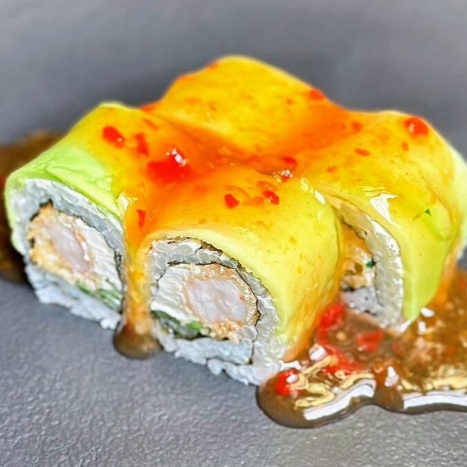 Abacate, camarão, cream cheese, pepino, arroz e pimenta agridoce