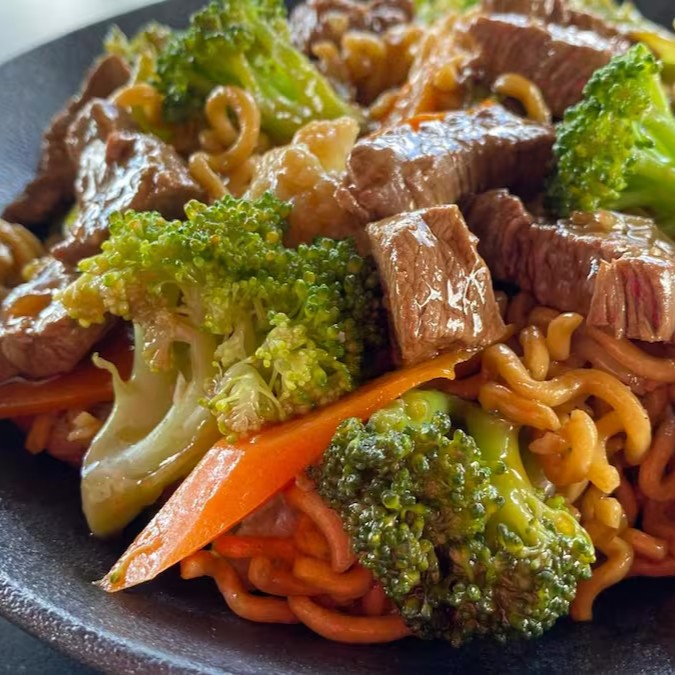 Macarrão, mignon, frango, legumes e molho oriental especial.