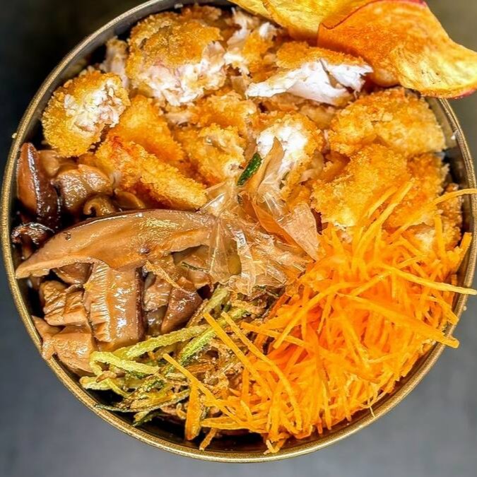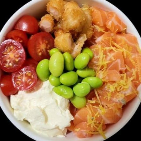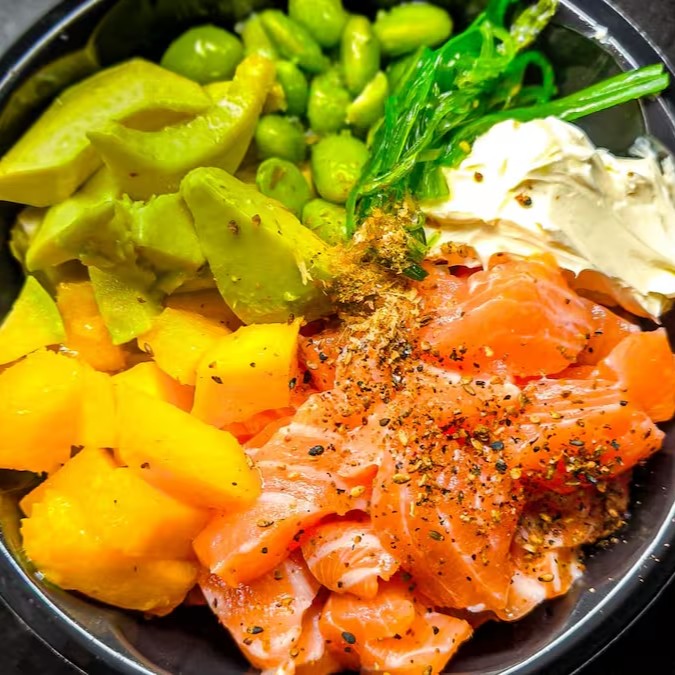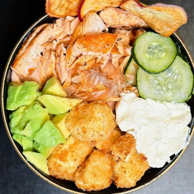 Arroz, salmão, cream cheese crispy de batata doce e molho tarê.