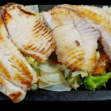 Filé de tilápia grelhada com legumes salteados. Acompanha arroz.
