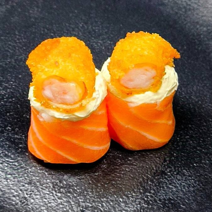 Camarão empanado, pepino, cream cheese, arroz e molho tarê, envolto por salmão