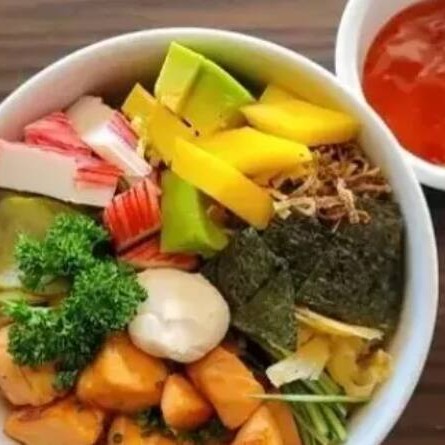 Arroz, salmão, maionese e pimenta tailandesa.